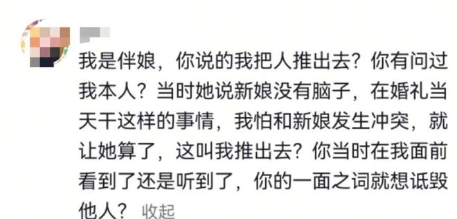 关于推人事件,伴娘表示:“他们工作人员指着新娘骂‘穷鬼事多’,我不拦着难道看着姐妹受气?”