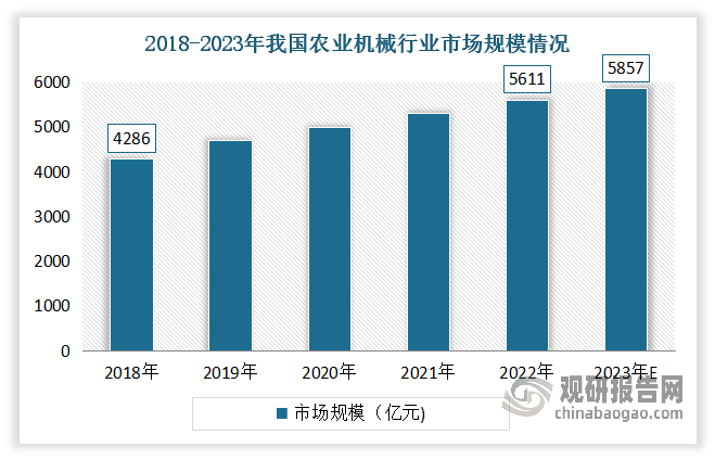 市场不断扩大。数据显示,2018-2022年我国农业机械行业市场规模由4286亿元增长至5611亿元,年均复合增长率达8.4%。估计2023年我国农业机械市场规模将在5857亿元左右。