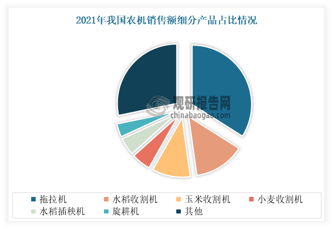 其中一直以来,拖拉机在我国农业机械市场中占比处于较高地位。以2021年的数据为例,2021年在农业机械市场中,拖拉机销售额占比最大,达到33.96%;其次为水稻收割机及玉米收割机,销售额占比分别为13.82%和10.37%,