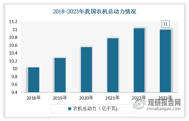 机械总动力持续增长。近年我国农业机械总动力持续增长,到目前已经成为农业生产中不可或缺的一部分。农民也越来越依赖农业机械进行生产,对于提高生产效率和降低劳动强度有着重要作用。数据显示,2023年我国农机总动力达到11亿千瓦。