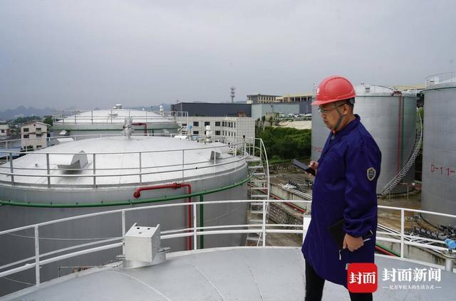 在贵阳郊区一家民营储油企业,应急管理专家张傲翔爬上油罐顶检查。封面新闻记者 卢荡 摄